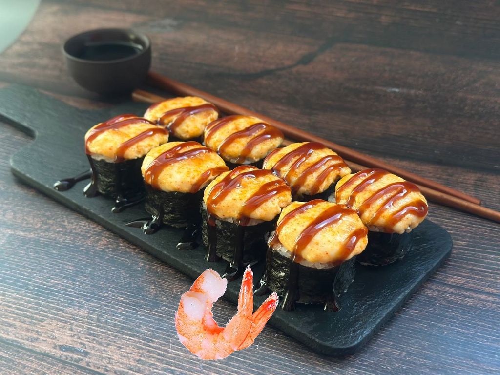 Запеченный эби 445 руб. В корзину Запеченный ролл с сливочным сыром, креветкой, освежающим зеленым луком и шапочкой для запекания, полит унаги соусом. (210гр) Запеченный ролл с сливочным сыром, креветкой, освежающим зеленым луком и шапочкой для запекания, полит унаги соусом. (210гр)