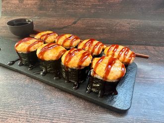 Запеченный с лососем и креветкой 490 руб. 545 руб. В корзину Креветка, лосось, сыр сливочный, огурец, икра тобико, снежный краб, соус для запекания, унаги соус.(235гр) Креветка, лосось, сыр сливочный, огурец, икра тобико, снежный краб, соус для запекания, унаги соус.(235гр)