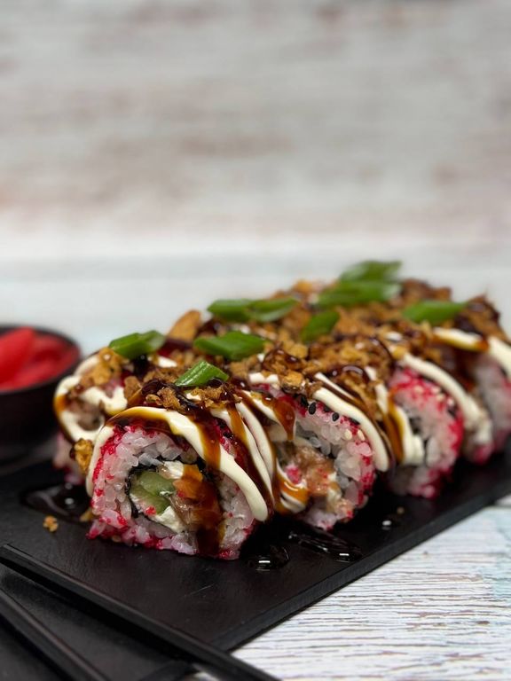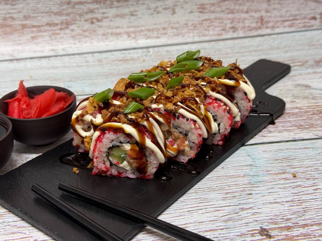 Фиш фри 460 руб. В корзину Сливочный сыр, огурец, рубленный лосось, икра тобико, кунжут, майонез, терияке соус, лук фри, лук зеленый.(200гр) Сливочный сыр, огурец, рубленный лосось, икра тобико, кунжут, майонез, терияке соус, лук фри, лук зеленый.(200гр)